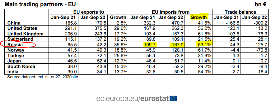 É que tiveram que ir buscar então 31% a outro lado. A preços incomportáveis a longo prazo. E se alguém pensa que é só aguentarmos um pouco com estes preços destrutivos para a economia europeia, que a Rússia irá ceder economicamente primeiro, é melhor verificar os dados que vem da própria Europa:
